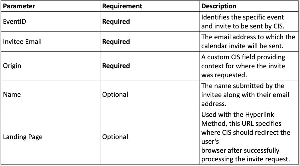 The Send Invite API call requires a specific set of data parameters to execute correctly, providing the CIS with all necessary information to generate and track the invite.