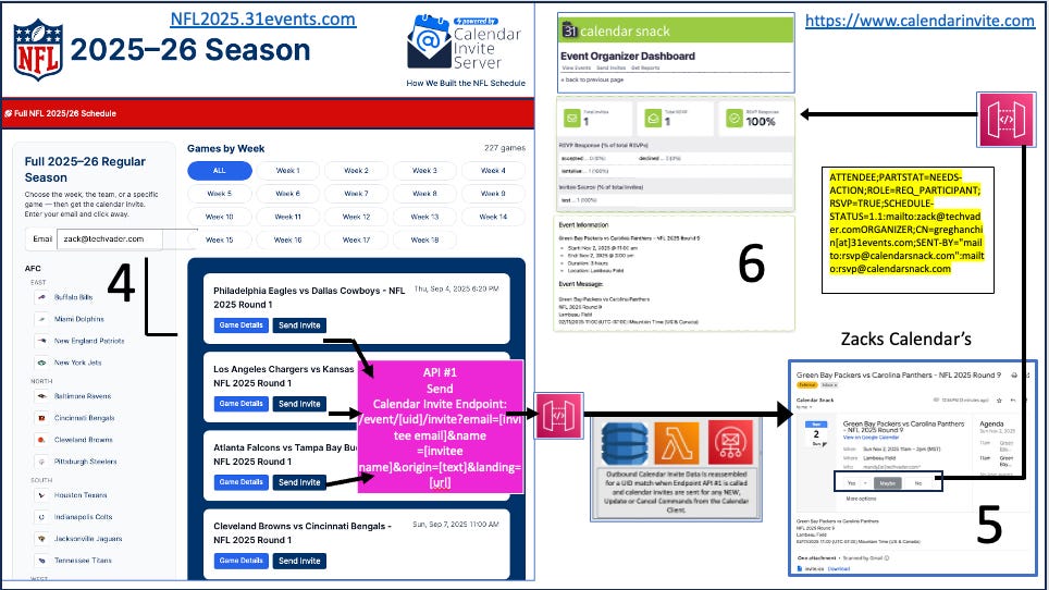 Upon receiving a valid Send Invite API request, the Calendar Invite Server sends the calendar invite to the user’s email inbox and calendar simultaneously. It also automatically creates an Invitee record