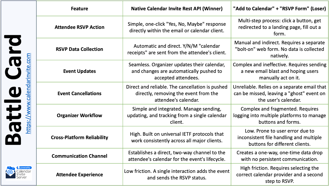 The CIS platform is positioned as a superior solution to the combination of “Add to Calendar” buttons and separate RSVP forms. The key differentiators are summarized below.