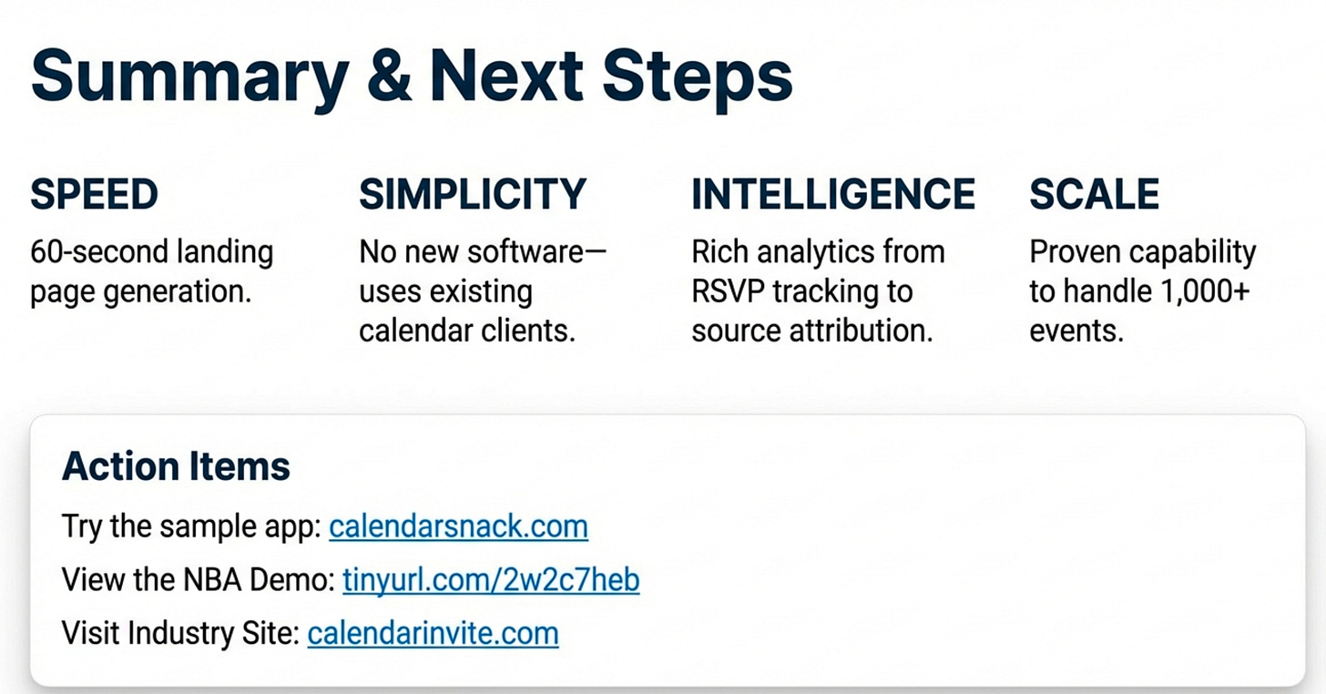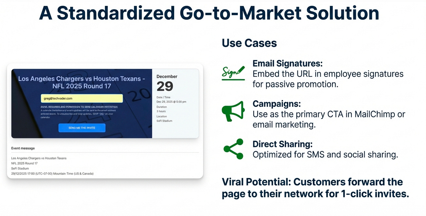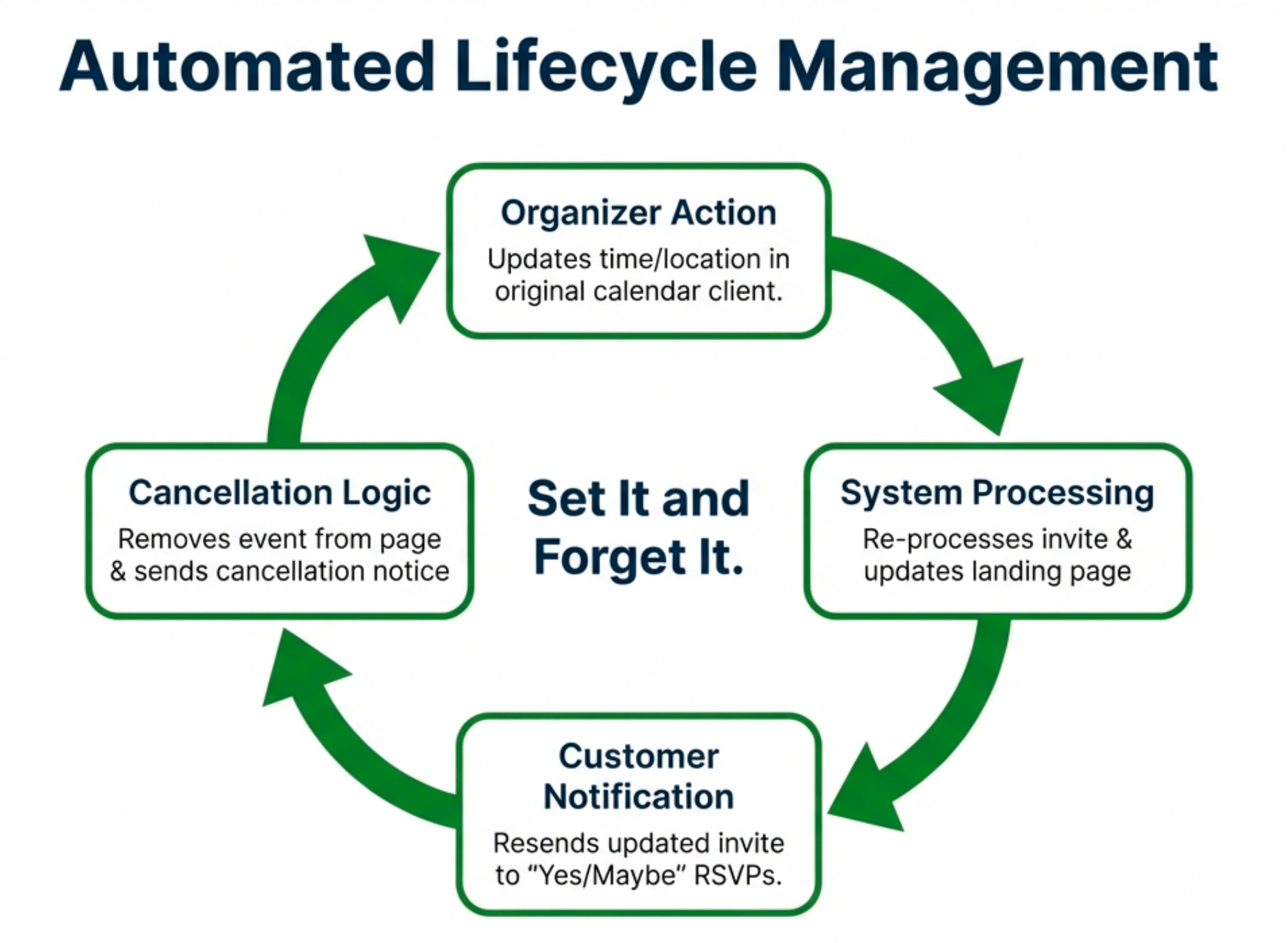 Updating an Event: If an organizer needs to change the date, time, or location, they simply edit the event in their own calendar and save it. Crucially, this extends to strategic marketing. An organizer can update the event description to include a “promotional offer to entice the customer to engage, based on timelines or specific times within the promotion window.” The system automatically updates the landing page and sends a revised calendar invitation to everyone who had already responded “Yes” or “Maybe.”
