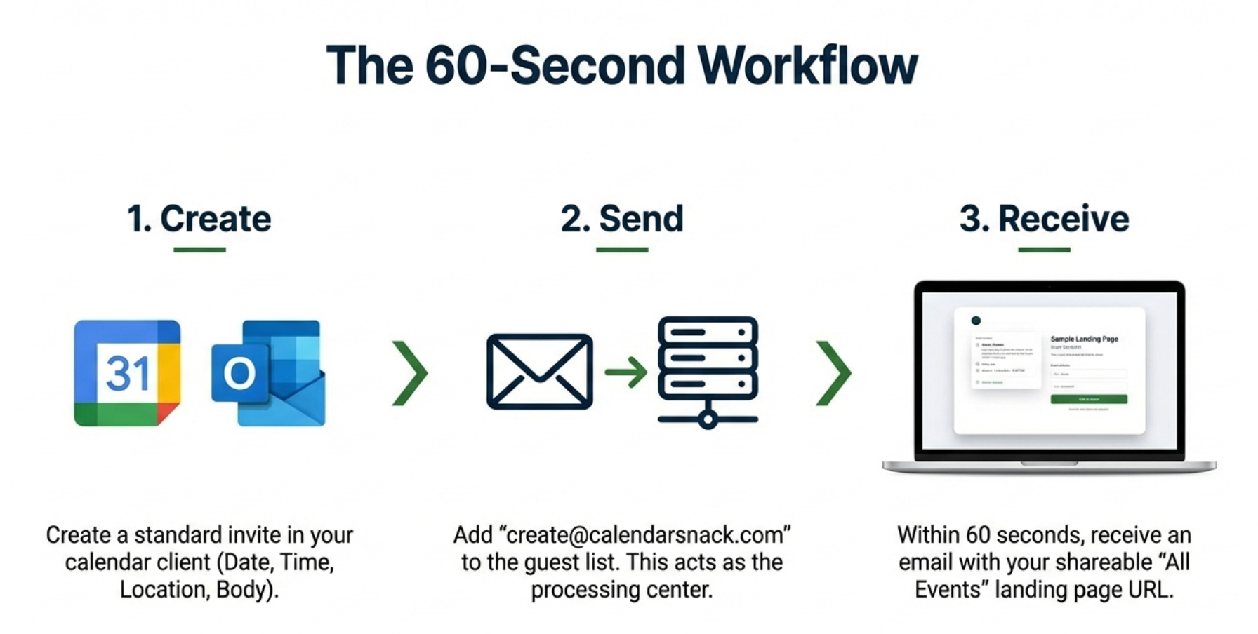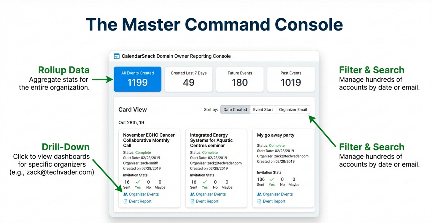This system is built for scale, allowing a single organizer to process up to 2,000 individual events from their calendar client to the drop off email box.