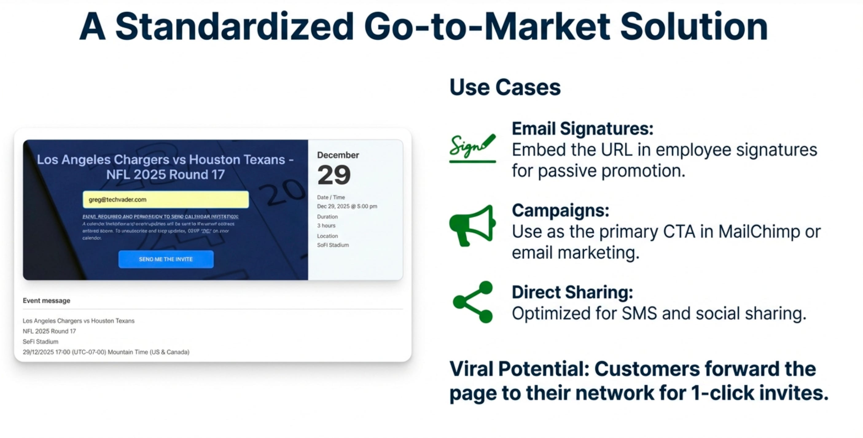 The shareable “All Events” page becomes a powerful, central call-to-action (CTA) that can be deployed across all marketing channels. Teams can embed this single link in employee email signatures, on company websites, or as the primary CTA in email marketing campaigns through services like MailChimp.