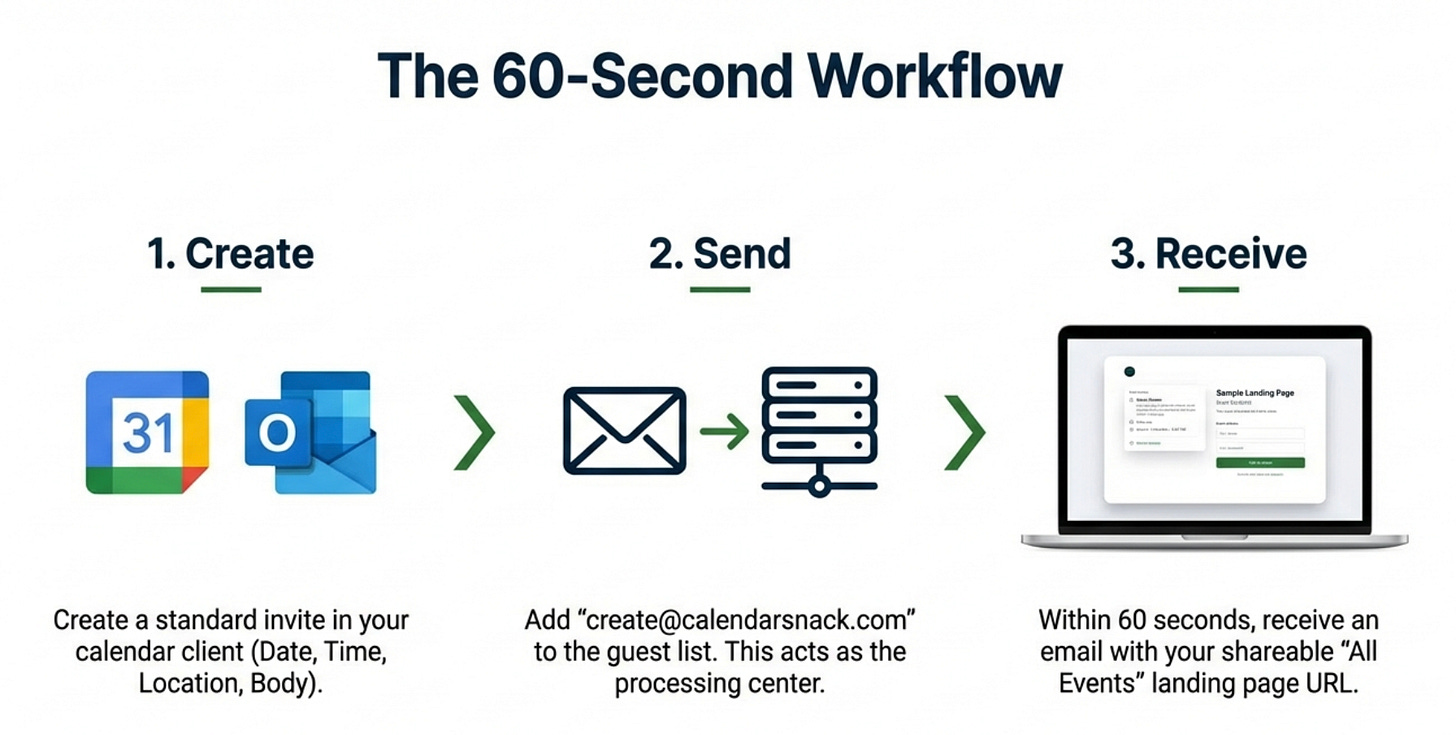 Instead of inviting attendees directly, they send the single calendar invitation to a specific, designated email address (for example, create@calendarsnack.com).