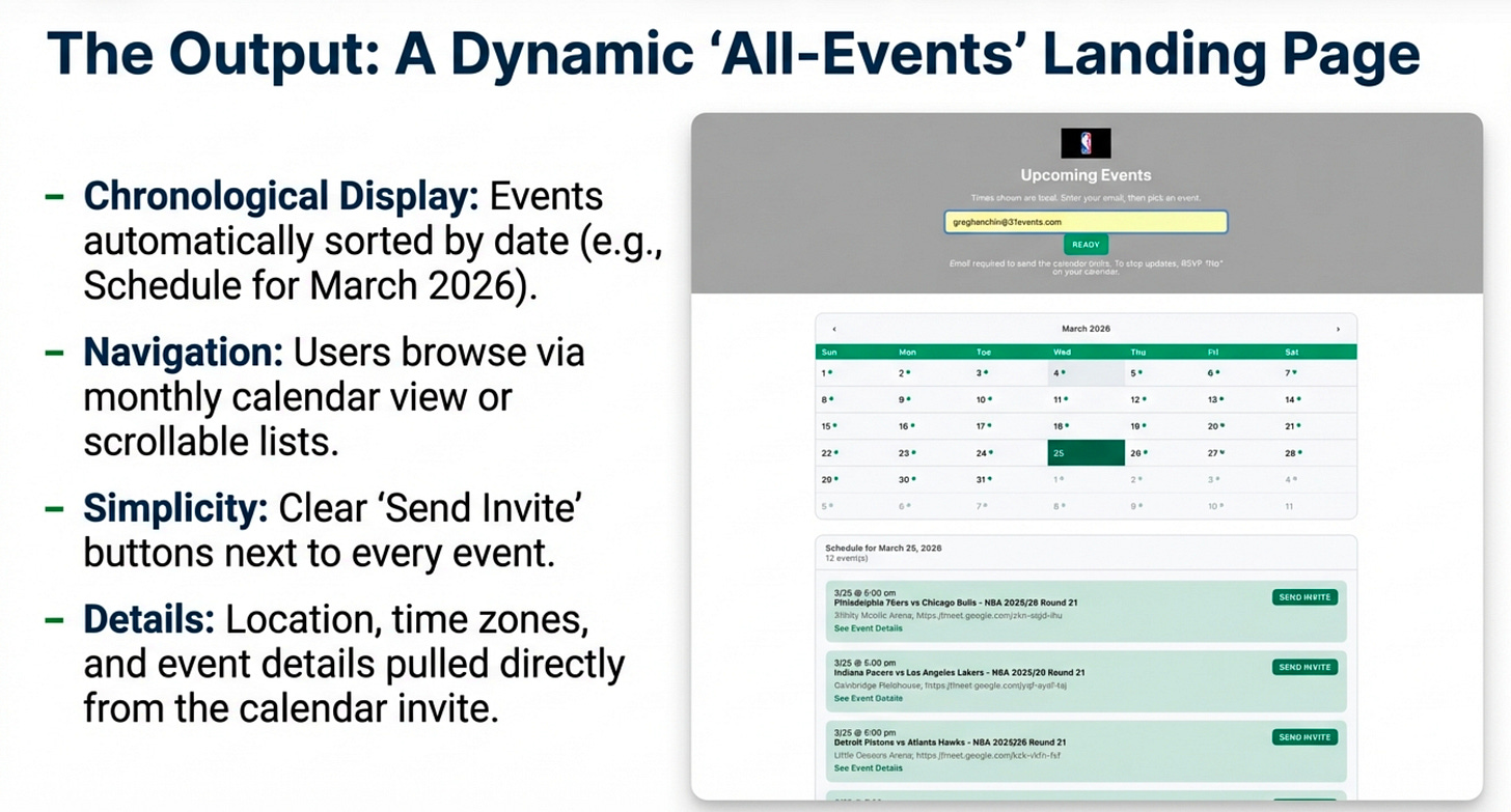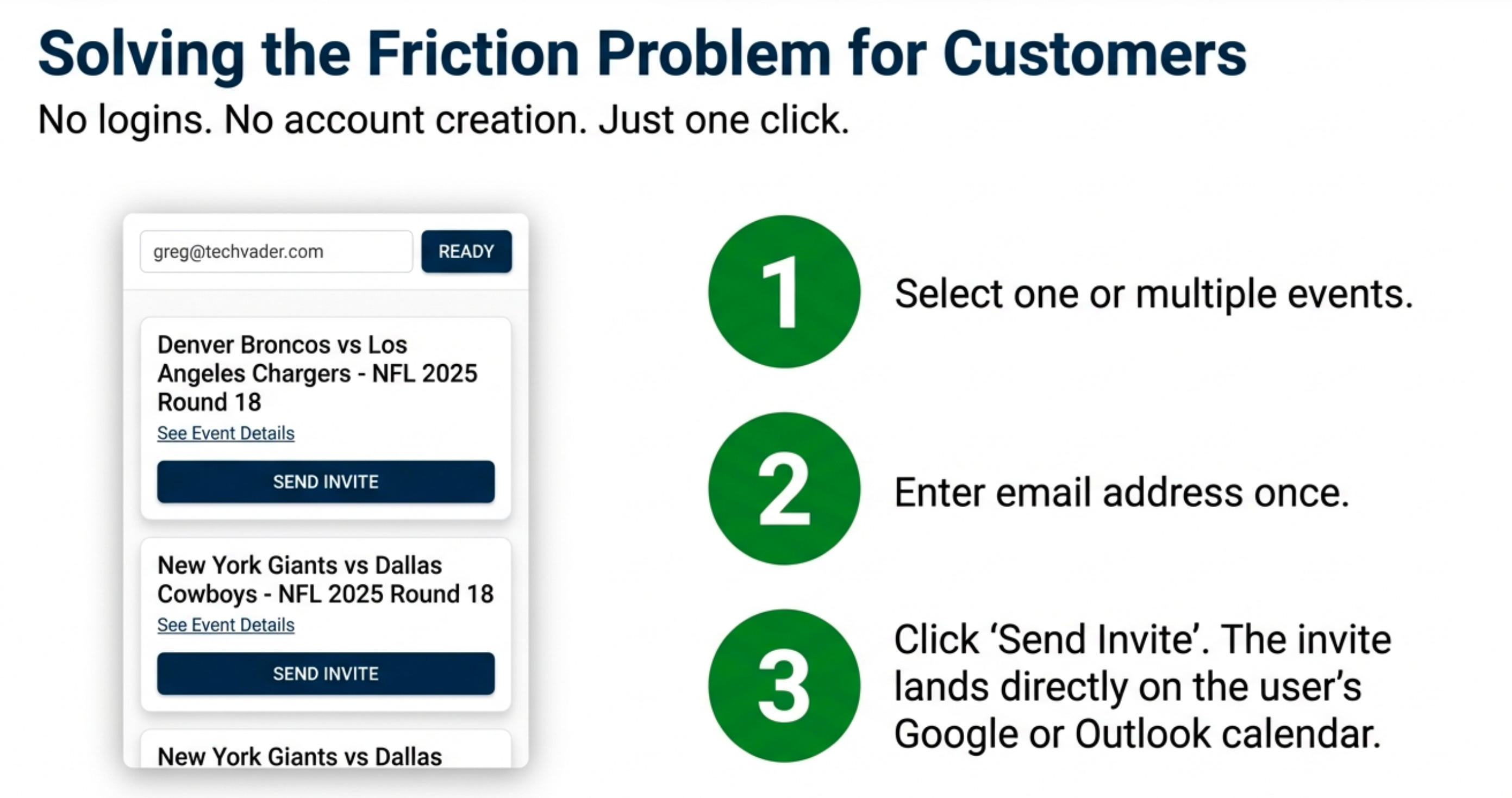 To register, they enter their email address once in the box at the top of the page. After that, they can request an invite for a single event or select multiple events in the same session, clicking the “Send Invite” button next to each one that interests them. This single click sends the official calendar invitation directly to their inbox and places it on their calendar, solving the chronic problem of users seeing an event but forgetting to manually add it to their schedule.