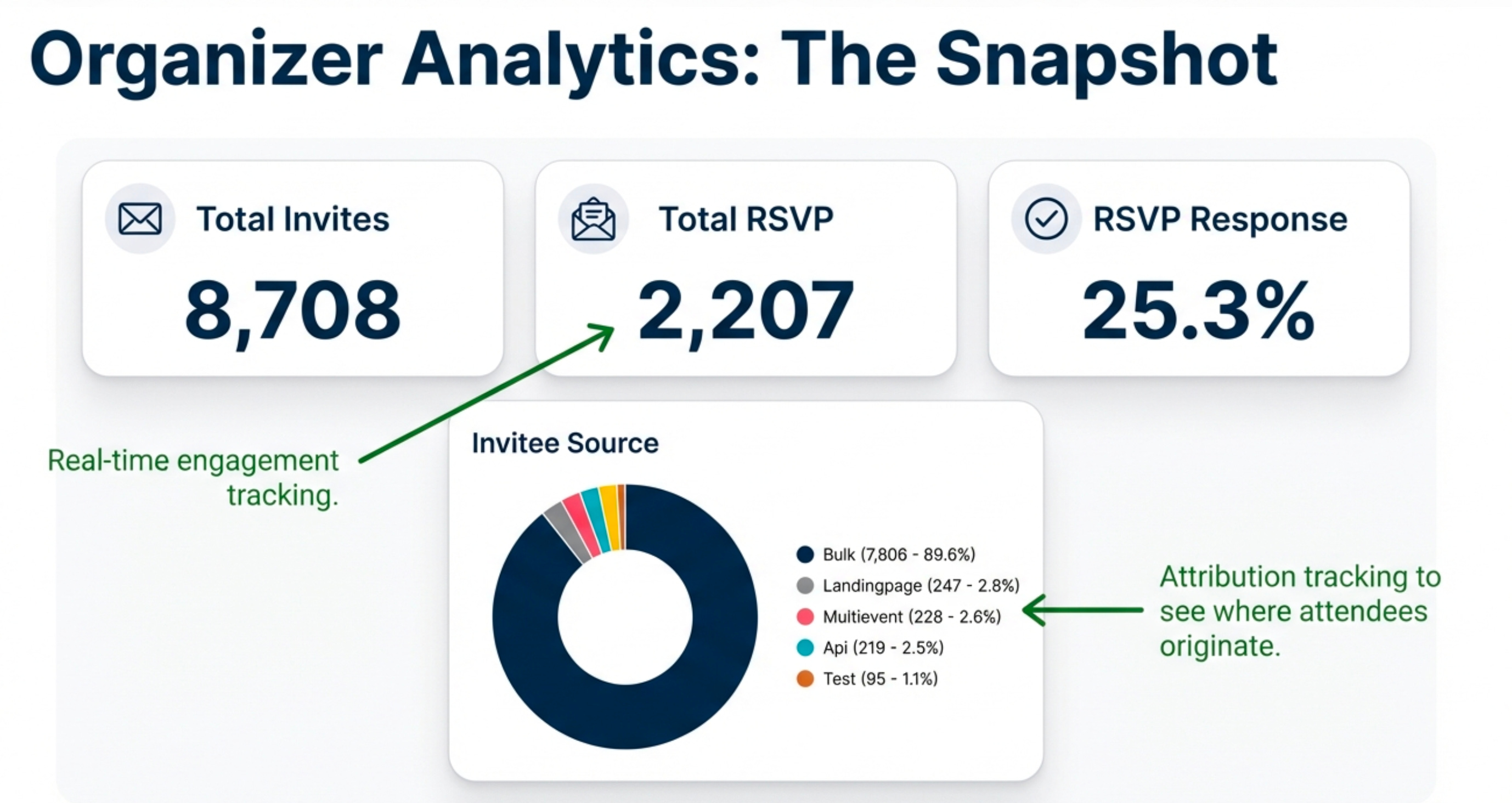 Each invitation is assigned a unique ID (UID), allowing the organizer to see detailed analytics on a private reporting page. The analytics hierarchy provides multiple layers of insight, starting with the organizer’s view.