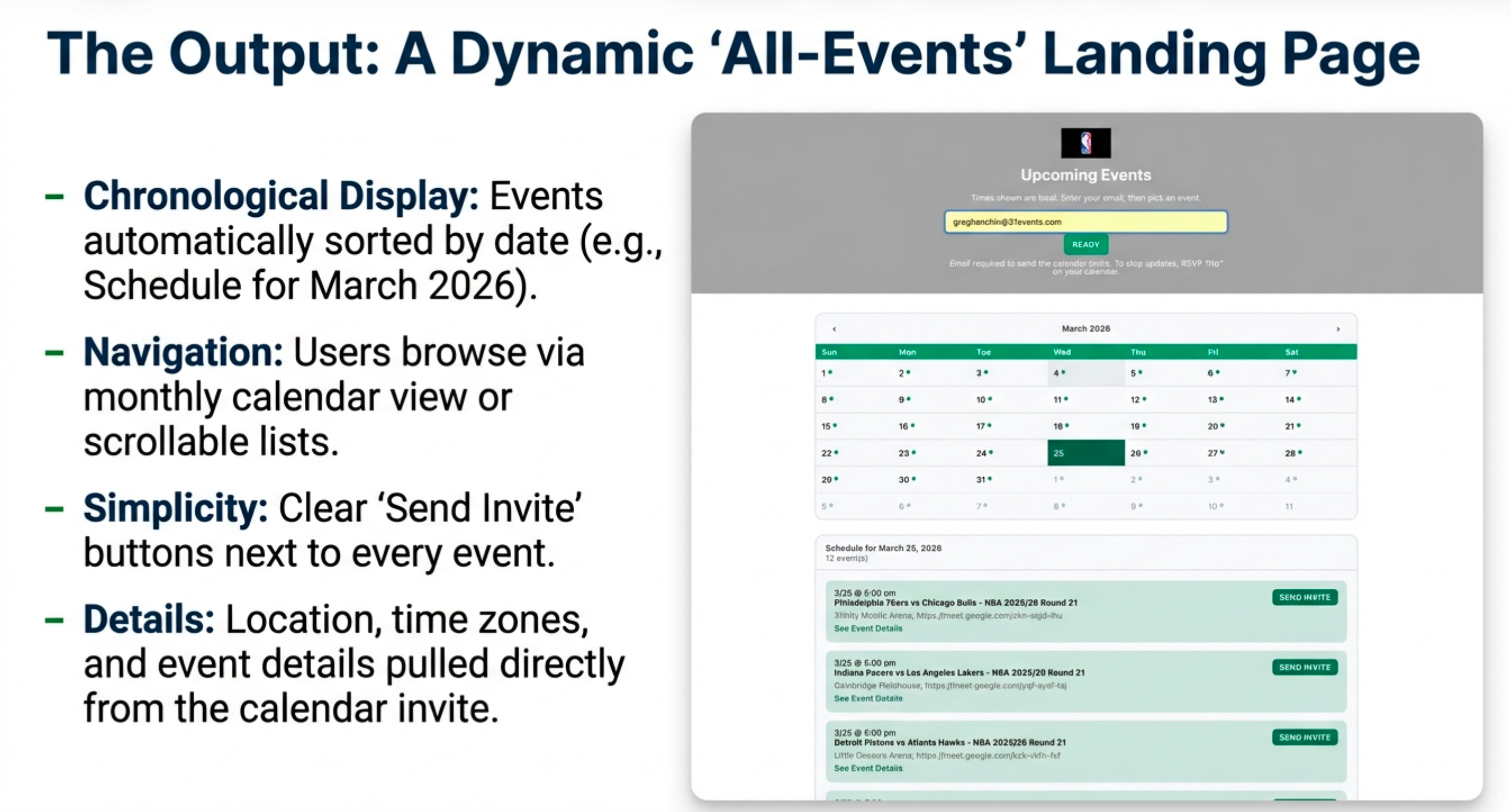 Depending on the use case—whether a few corporate webinars or an entire NBA season—the layout can be a chronological list with a “load more events” button or a full monthly calendar view.