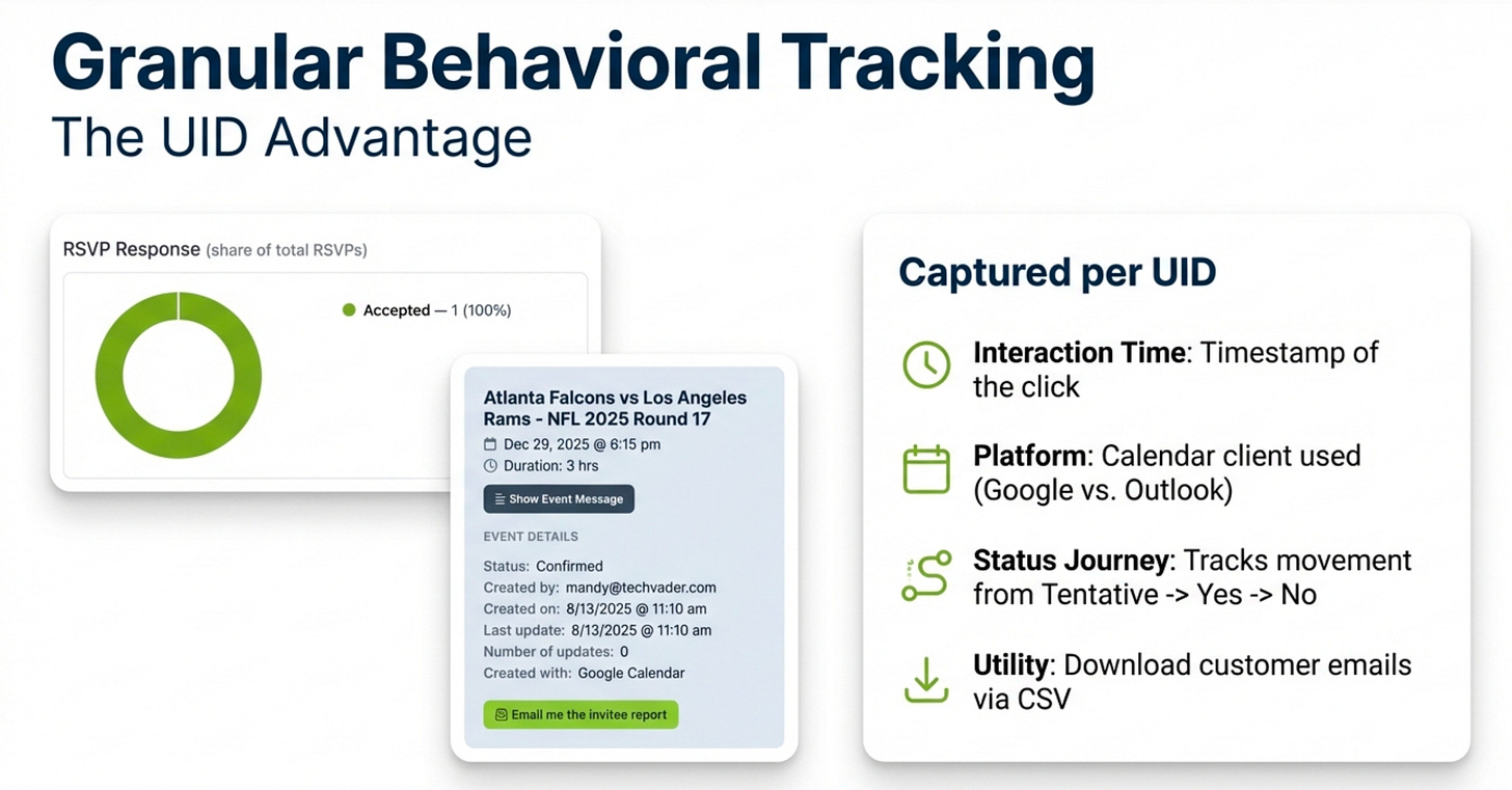 Unlike a standard email invitation, which offers no feedback, every invite sent through this system is a trackable asset since it’s talking the IETF specification for crating, sending, updating and tracking calendar invites.